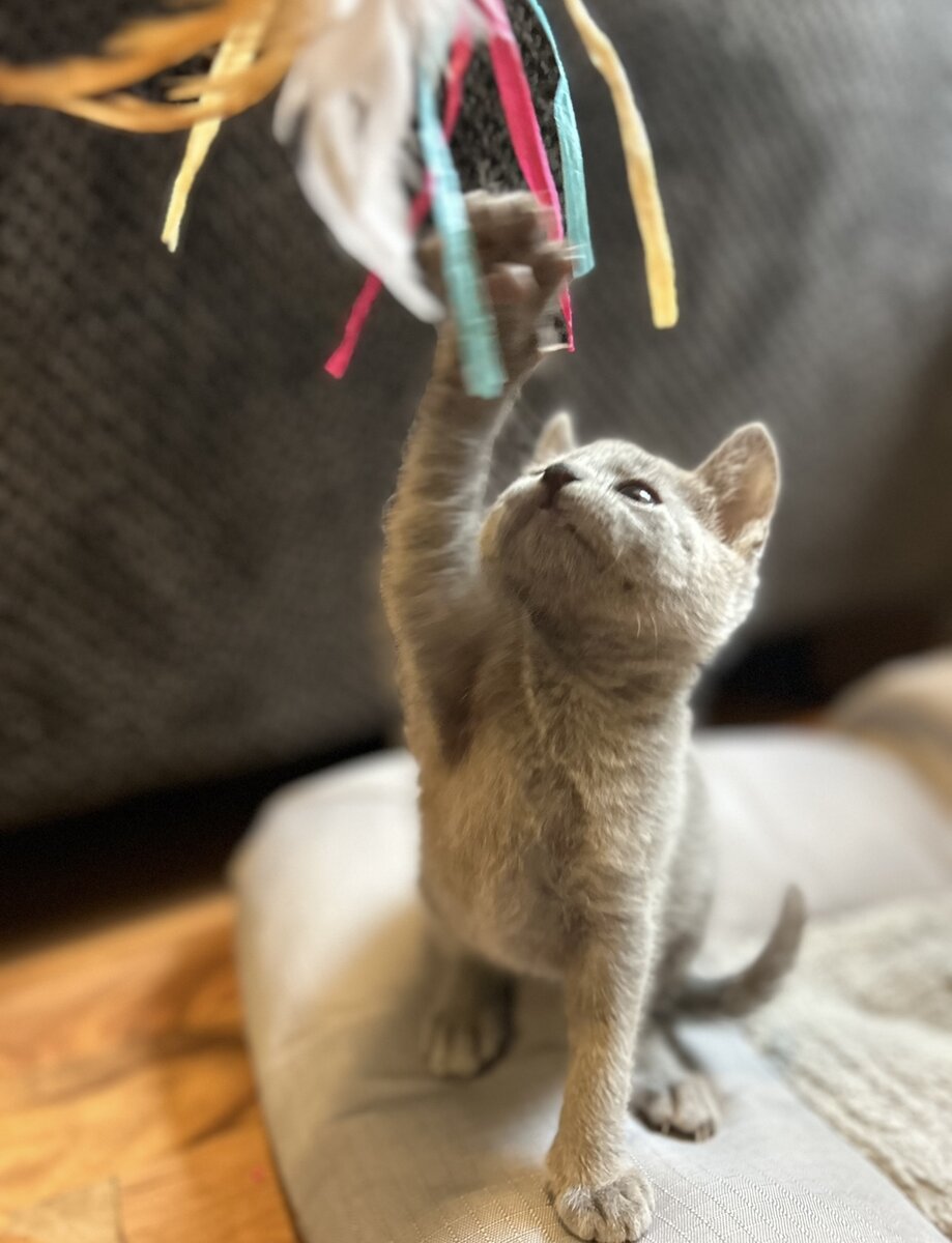 Чуть больше двух месяцев назад у нас родились котята породы русская голубая кошка. Один котенок, девочка, был настолько мал, что мы, первое время, думали, она не выживeт. Прям совсем крошечная. Раза в три меньше, чем ее четыре братика. В семь недель мы повели котят к ветеринару. Котятам сделали прививки. Всем, кроме нашей малышки. Сказали, что для прививок она еще слишком мала. Почему так вышло с котенком, ветеринар не знает. Но она совершенно здорова. А для прививок нужно просто немножко подрасти и окрепнуть. И вот, всех мальчишек мы продали, а девочку эту решили себе оставить. Эля назвала ее Куки (печенька). И так ее полюбила. Везде с собой носит. И спит с ней. И гуляет. И в машине ездит. Куки привыкла к Эле. Вечерами ждет, когда ее в кроватку позовут. Спать. А недавно вышла Эля с ней во двор и забыла там Куки. Разыскивали всей семьей. Нашли в гараже. Оказывается Эля за мороженым полезла в морозилку (да, у нас в гараже стоит морозилка). Куки, видимо, на пол поставила и п