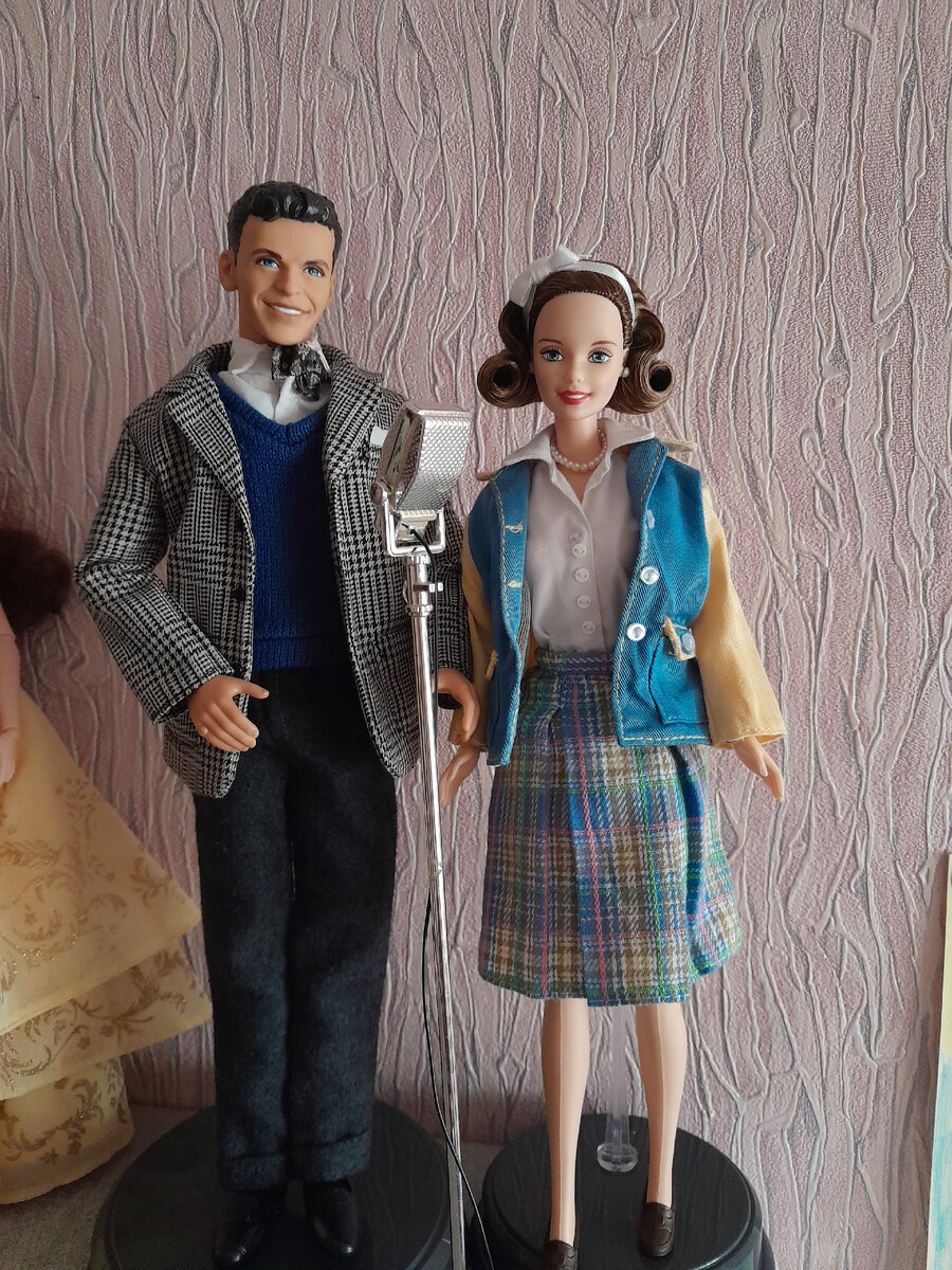 Утром меня осенило, что я забыла вам показать, кто пел на свадьбе Мэгги Мидж и Джеймса. А ведь обещала живую музыку и держала покупку в секрете) Две недели назад я купила чудесных кукол, которые были почетными гостями на свадьбе)) Набор Барби любит Фрэнка Синатру❤️ Набор распакован, но в идеальном состоянии, куколки в полном аутфите, микрофон, коробка, пластинка, все бумаги. Фрэнк Синатра мой любимый певец❤️❤️❤️ куколку я назвала Лили) и сняла ей носочки, чтобы туфельки не слетали) Второй раз после Люси и Дези мне попадается набор, в который маттел душу вложил при создании, сразу видно, кто кумиры) костюмы восхитительные, полностью по моде того времени, носочки (у Фрэнка тоже), проработана каждая мелочь, от пуговок до печатки Фрэнка на мизинце)) а пластинка)) я сразу вспомнила фото первого дома Барби с пластинками на полке. Итак, фото Фрэнк стоит на подставке, куколка больше на него опирается, чем на свою подставку)) она очень красивая и счастлива быть рядом с кумиром)) а мне кажетс