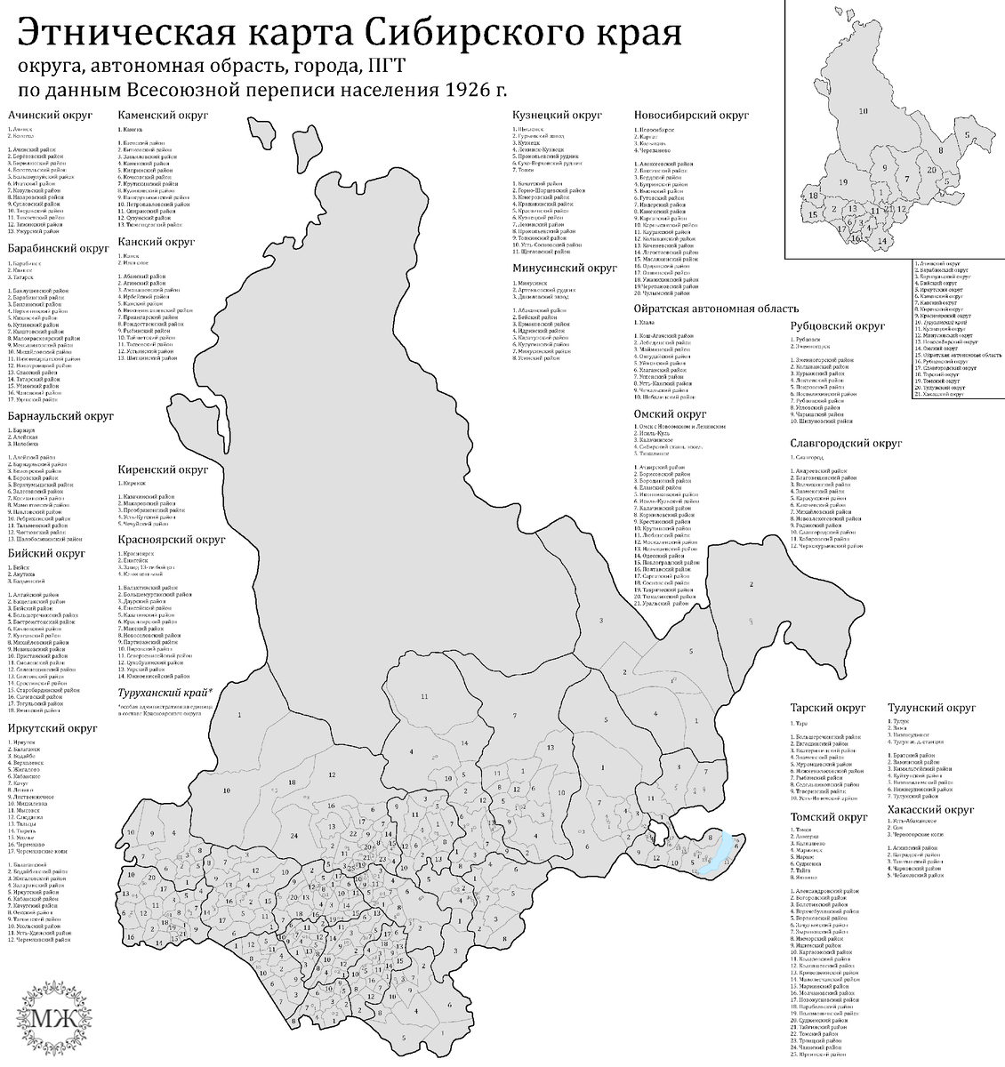 Помимо этого, видны ослабевшие позиции украинцев. В одном районе Омского округа и в половине районов Славгородского округа большинство при переходе на язык ушло к русским. Паритет при 8 украинских районах и 4 русских плюс Славгород сместился на 4 и 8 плюс Славгород соответственно. Большинство в округе также сместилось, как оно сместилось и в Хакасском округе, где как и в случае с остяками разница была небольшая. В итоге округов с языковым большинством иной национальности уже на 1926 год не оказалось.