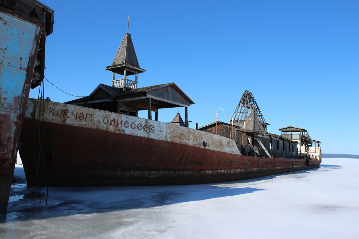 Плавучий ресторан, который ранее радовал посетителей в гавани у главной городской набережной, теперь умирает на вечном приколе рядом с небольшим кладбищем кораблей. Лед, который застыл на Онежском озере, позволил подойти к этому кораблю-ресторану, забраться на его палубу и исследовать внутренние помещения. Плавучий развлекательный комплекс "Ковчег Одиссеев" был создан из переоборудованной металлической несамоходной баржи. В свои лучшие годы он считался одним из главных мест в городе, расположенный на набережной в туристическом центре. Однако с течением времени он утратил свою популярность и сейчас, покрытый ржавчиной и потерявший свое великолепие, стоит у причала в промышленной зоне, среди других старых барж, которые также остались навсегда на месте. Здесь видны следы прежней роскоши - ограждение из деревянных балясин и изогнутые консоли светильников. Заберемся на корабль. Зайдем в старую хижину. Стены отделаны деревянными панелями. Когда-то здесь были стул и скамейка, а сейчас нахо