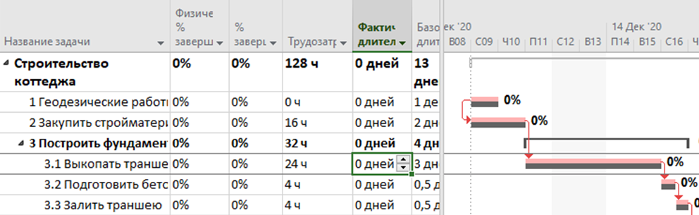 В Microsoft Project используется три встроенных параметра измерения прогресса хода работ по проекту: · % завершения. · % завершения по трудозатратам. · Физический % завершения. В этом Уроке 29 рассмотрим Физический % завершения. Поле Физический % завершения создано для возможности вводить данные о фактическом проценте выполнения работ по задаче, в том числе информацию по задачам, касающимся тех работ, результат которых можно измерить объективным физическими мерами, тоннами, кубометрами, метрами, штуками. Физический % завершения позволяет объективно оценивать % выполнения работы, в том числе, в физических мерах измерения. Рассмотрим Пример. Откроем файл Стройка 11 Базовый план сохранен. Вставим столбцы % завершения и Физический % завершения. Сохраним файл под именем Стройка 29 Физический процент завершения. Рассмотрим такой пример. В задаче 3.1 Выкопать траншею, общая длина траншеи – 40 метров. На момент контроля хода работ: Фактическая длительность работ – 2 дня. Выкопано 20 метров т