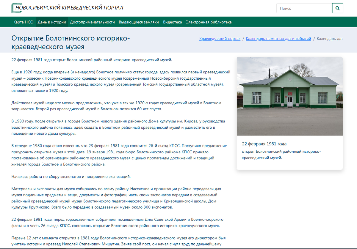 Терентьев Евгений. Открытие Болотнинского историко-краеведческого музея // Новосибирский краеведческий портал, НГОНБ