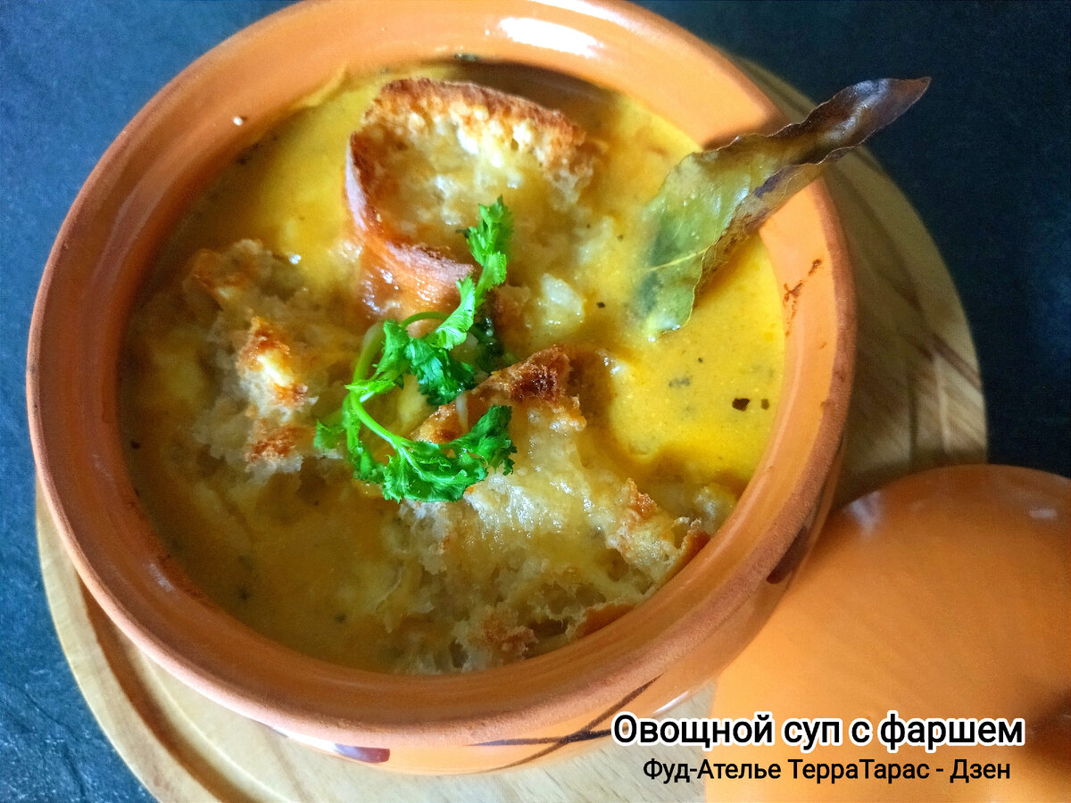 Овощной суп - пюре с мясным фаршем (на тему Минестроне, как я его увидел) . - Лук репч. 1 шт. - Морковь 1 шт. - Перец болг. 1 шт. - Кабачок 1/2 шт. - Картофель 2 шт. - Тыква Баттернат 1/3 шт. - Чеснок 3 зубчиков - Томат 1 шт. - Овощной сток ~ 2 л. - Фарш говяжий (можно микс) 0,3 кг. - Масло ол., сливки, чиабата, орегано, сыр твёрдый, куркума, чили суш., лавр. лист, белое вино столовое. Все овощи нарезать хаотично, средним кубиком. Обжарить лук с морковью на оливковом масле, добавить чеснок и перец болг. Присыпать куркумой, орегано и чуть чили, хорошенько перемешать, добавить бел. вино, выпарить наполовину. Залить овощным стоком, дать закипеть, и закладываем кабачок, тыкву с картофелем. Варим до готовности овощей. Параллельно обжарить фарш ,плюс соль, перец, лавр. лист. Далее,суп разбить блендером до однородной консистенции, добавить фарш обжареный, дать закипеть, сливки туда же, оставить на медленном огне минут на 10 под крышкой. Вот тут занудство закончилось и начинается на