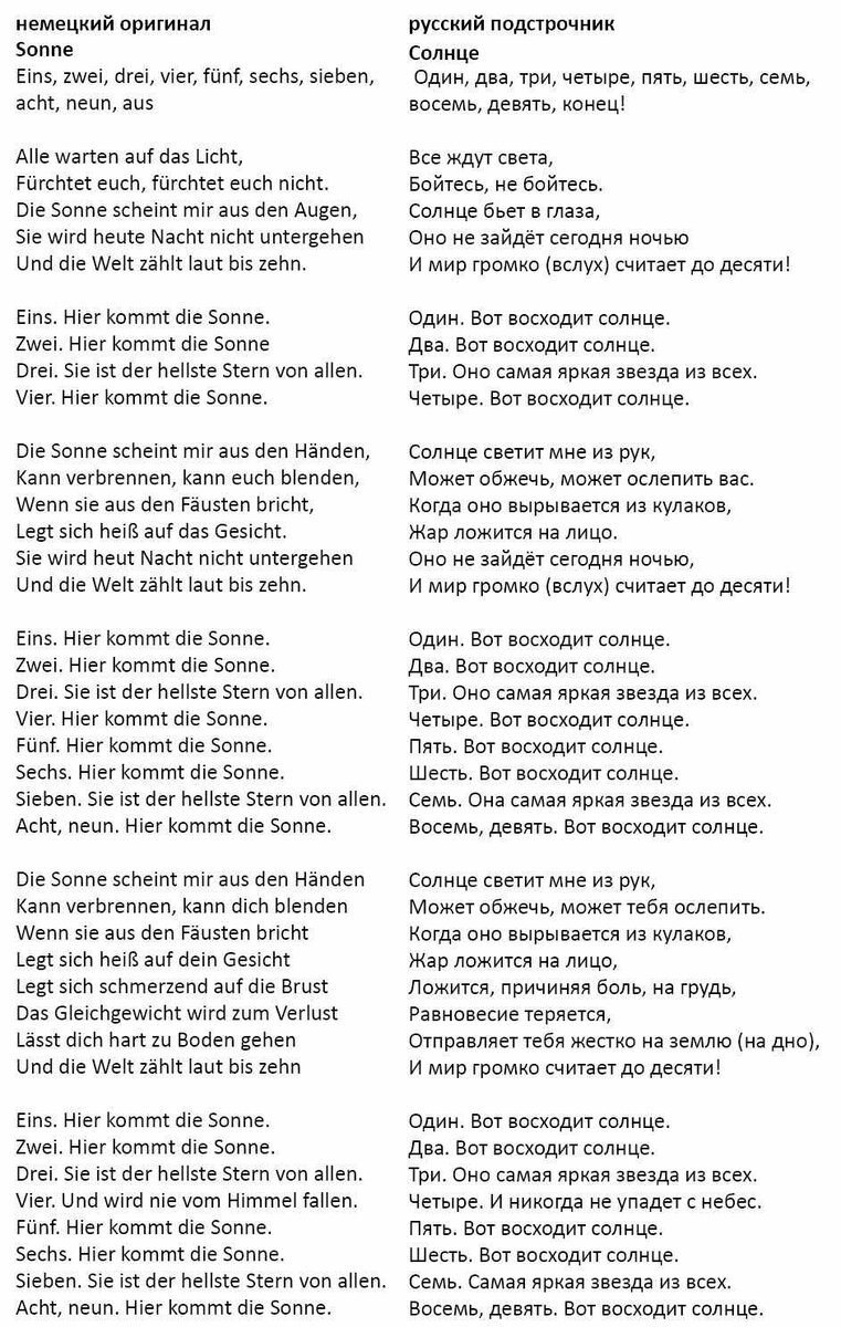 Выкладываю свой очередной перевод песни ВИА «Рамштайн» «Солнце», на который снят очень интересный (впрочем, у немецких рокеров других и нет) и красивый клип. Надо заметить, что Солнце - в немецком языке женского рода, да вот такой интересный подвыверт: девочка у них среднего рода - Das Madchen - Оно, а солнце - die Sonne - Она. Поэтому в клипе персонификацией Солнца выступает ослепительно красивая и притягательная девушка Белоснежка (ее играет русская актриса, между прочим). Поэтому и возникает такой очень интересный романтически-сексуальный подтекст в композиции. Солнце Раз, два, три, четыре, пять, шесть, семь, восемь, девять, все!