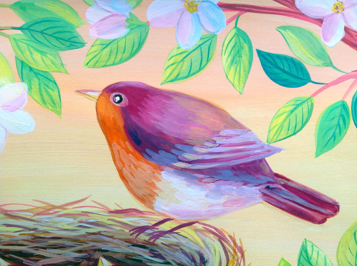 Время весны способствует пробуждению природы : на деревьях распускаются цветы и листья, птицы вьют гнезда, выводят потомство. Для данного сюжета я выбрала цвета теплой гаммы, так как герои сюжета птички – малиновки с оперением теплых цветов. Выбор общей теплой цветовой гаммы из родственных цветов поможет ускорить процесс работы, потому что рисовать мы будем на предварительно подготовленном фоне. При наложении цвета на предыдущий слой краски, цвета будут оставаться чистыми, этому будет способствовать родственная цветовая палитра. Смешение цветов в слоях краски, которое возможно при рисовании гуашью, не будет портить рисунок.