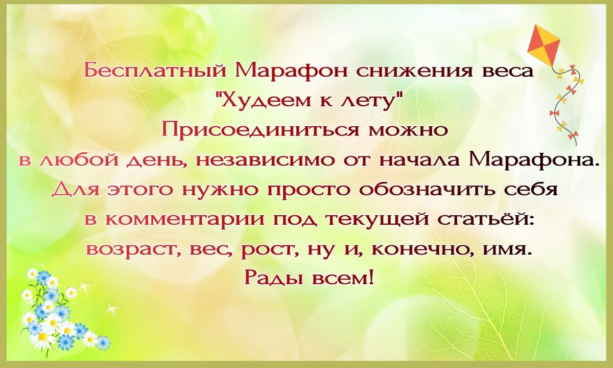 Бесплатный Марафон сижения веса "Худеем к лету" продолжает свой марафонский путь и мы уже отшагали 4 недели из 10-ти отведенных под него.