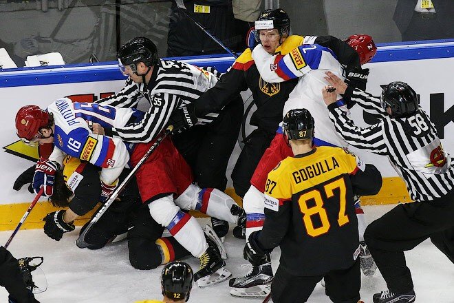 8 мая 2017 года, сборная России по хоккею одержала уверенную победу над немецкой сборной на чемпионате мира. Этот матч имел особое значение для обеих команд, особенно для сборной России, ведь ровно 72 года назад (по Берлинскому времени) германские войска капитулировали, тем самым закончилась Великая Отечественная война разгромом немецко-фашистских захватчиков. Игра началась с натиска нашей сборной на ворота Томаса Грайсса, уже на второй минуте в составе россиян отметился нападающий Вадим Шипачев с передачи Евгения Дадонова и Артемия Панарина. Преимущество сборной России к концу первого периода было очевидным, наша сборная за 20 минут забила 3 безответных шайбы. Во втором периоде немецкой сборной удалось сократить разницу в счете, однако россияне тут же ответили двумя голами. В третьем периоде игра стала еще более напряженной, но сборная России сохранила свое преимущество и довела матч до победы со счетом 6:3. Главными героями матча в составе сборной России стали нападающие Вадим Ш
