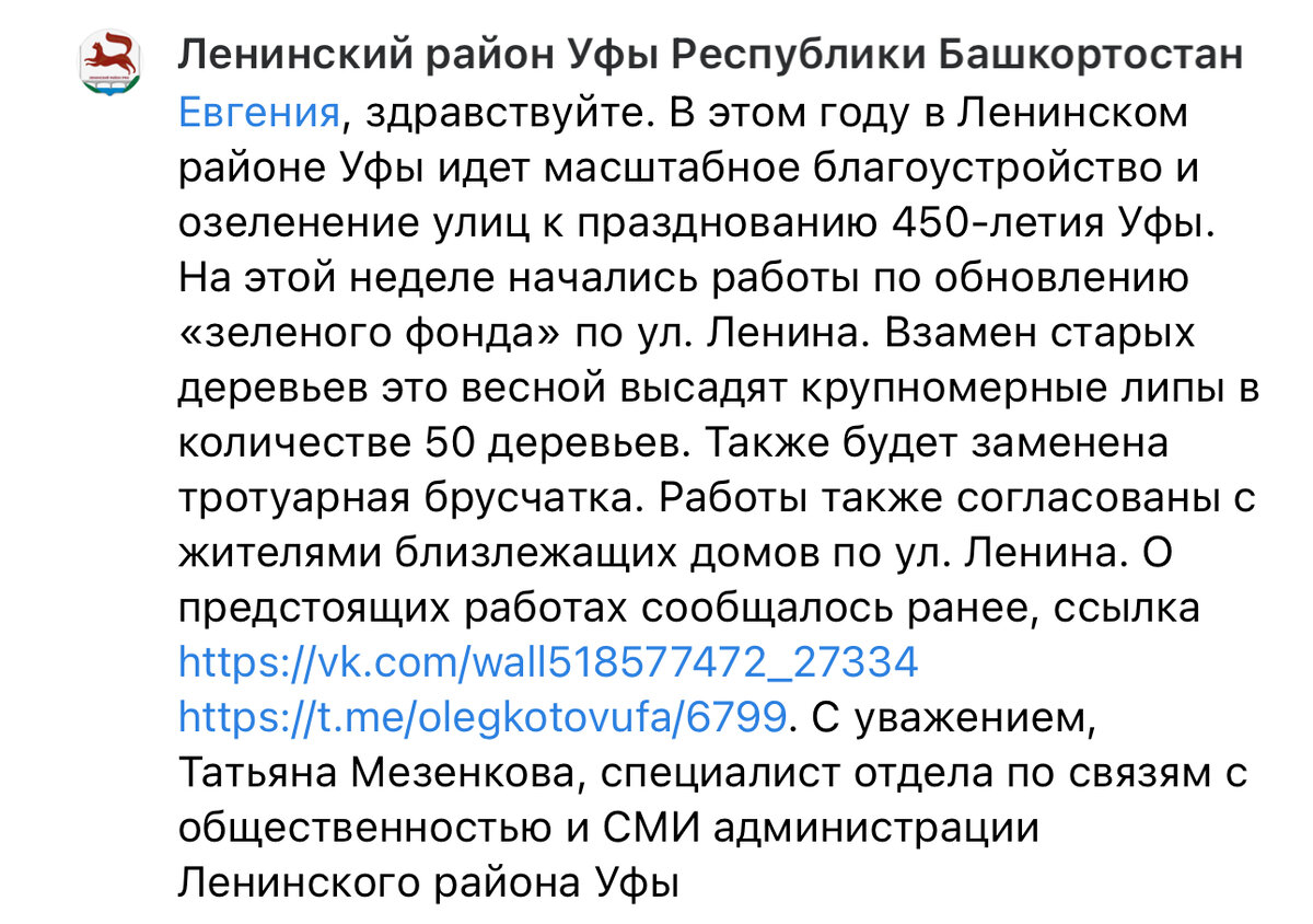 А появляется дополнительное основание для возбуждения уголовного дела на мэра Уфы. Ибо здесь впервые, помимо «мы ухудшаем, чтобы потом улучшить» и «отстаньте нам нужно свои деревья по тендерам купленные рассовать, а для этого срубить все многолетние ваши» вдруг появляется «а это жители согласились». Знаете, есть такая пословица про Божью росу, вот это как раз тот случай. И ссылки сотрудник Мезенкова дает на потрясающие посты, не объявления и просьба о разрешении, направленные местным жителям, а на ходу склепанные объяснения с фотографиями останков деревьев по предыдущему громкому, на тысячи комментариев, возмущению уфимцев спилу здоровых деревьев на Мустая Карима.