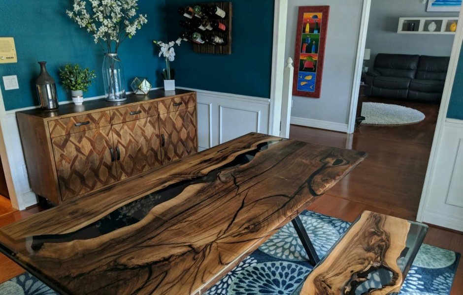 Узнайте, как выбрать идеальный стол для вашего пространства в нашей статье Необычные по дизайну столики-реки с использованием эпоксидной смолы разных оттенков выглядят стильно и оригинально. Изготовители и частные мастера предлагают разные варианты по цвету, назначению, конфигурации. Попробуем выяснить, почему эпоксидная смола в интерьере смотрится гармонично и завоевала популярность? В чем прелесть мебели, в которой странным образом соединились синтетическая смола и необработанная древесина? Лофт, минимализм, хай-тек, другие модные стили интерьера стремятся к простым формам, стеклу, металлу и монохрому, как в этом журнальном столике на платформе INMYROOM. Чем столешницы с эпоксидной смолой сумели завоевать потребителя? Скорее всего — необычным дизайном и странным союзом досок, фанеры, грубых деревянных слэбов с текучей, красиво застывающей эпоксидкой. Название «стол-река» обусловлено технологией заливки и внешним видом, напоминающим струящуюся по поверхности древесины бесцветную, голу
