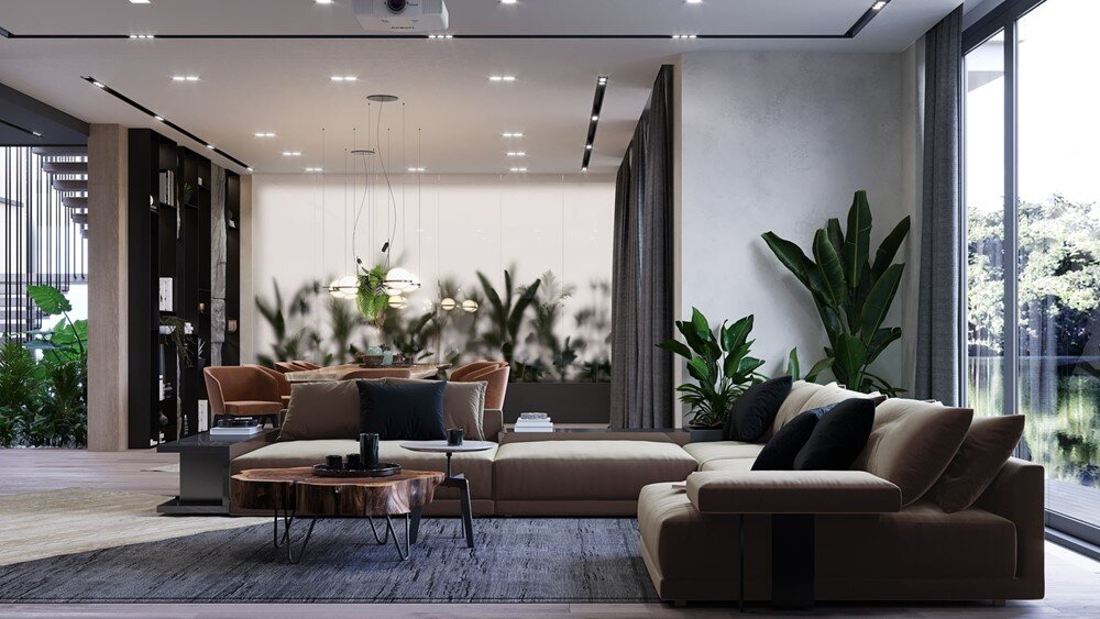 Zoloche Interior — проект, разработанный QUADER Architecture. По желанию клиента студия разработала интерьер загородного дома под Киевом с максимальным использованием природного сырья. Главный элемент интерьера — колотый камень. Дополнили его зеленью и металлическим декором. Столовая сделана из цельного куска дерева, длиной 4 метра. Зеленая зона состоит из насаждений, которые скрыты за матовым стеклом. При включении подсветки некоторые контуры размываются и получается эффект тумана. Массивные блоки из грубого камня расположены на первом этаже в холле, гостиной и столовой. Лестницу украшают живые растения, посаженные прямо под ступенями. Они упираются в панорамные окна. Такое решение создает визуальный эффект плавного перетекания внутреннего ландшафта в экстерьер. Использование землянистых тонов во всем интерьере, обилие натурального дерева и живых растений прекрасно реализует главную цель проекта — создание естественного пространства.