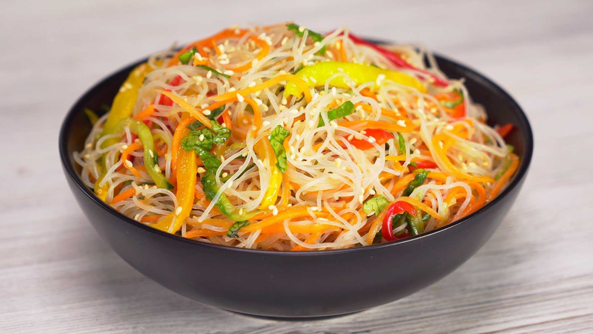 - 1 столовая ложка кунжутных семян для посыпки Приготовление: 1. Замочите стеклянную лапшу в горячей воде на 5-10 минут, пока она не станет мягкой. Затем слейте воду и остудите лапшу.