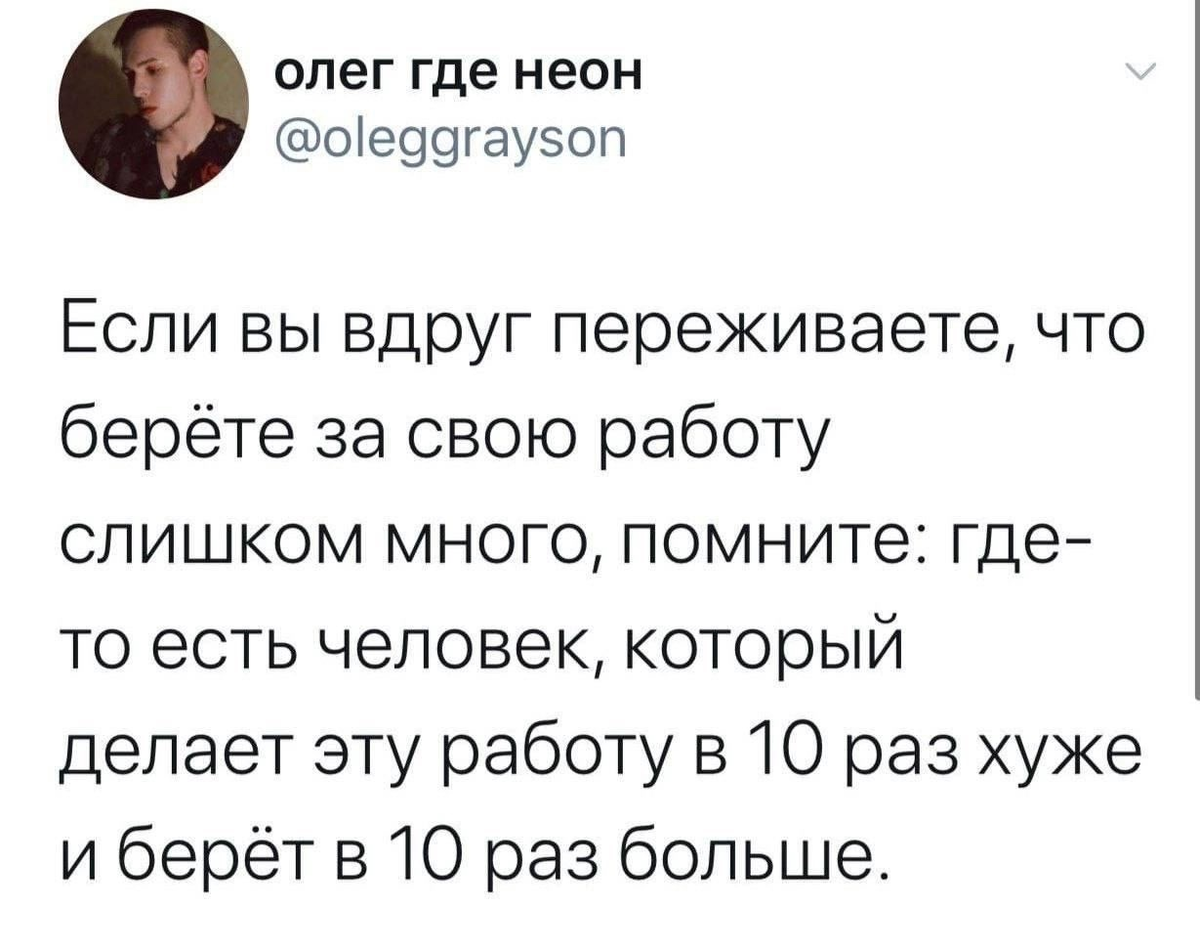Привет, друзья! Самое время вспомнить мемы о клиентах за 500 и за 50 000 рублей. Признайтесь: вам тоже больше нравится «Деньги перевел, спасибо» вместо «Давайте сделаем текст вкуснее и интереснее. Вот вам 100 правок»? Разбираемся, как повысить цены и перестать думать «А вдруг не купят». Главное — практика Чем чаще вы продаете свои услуги, тем меньше этот процесс вас триггерит. Страх «я умру от голода» уходит, если вы для себя обосновали, почему ваши тексты стоят N-денег. Об этом в следующем пункте :) Разложите опыт на молекулы Откройте заметки в смартфоне или берите чистый лист бумаги и расписывайте: сколько курсов прошли, с какими темами работали, сколько у вас опыта в профессии, сколько положительных отзывов от клиентов и классных кейсов. Объемно получилось? Тогда ваши тексты точно стоят дороже 500 рублей. Быть честным с собой Работа должна быть в кайф. Если вы страдаете от того, что зарабатываете мало, это скажется на качестве текстов. Вы хотите быть выгоревшим копирайтером или счас