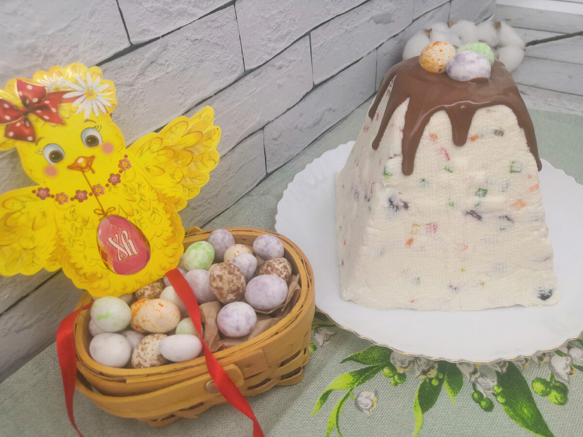 В преддверии светлого праздника хочу поделиться с вами замечательным рецептом творожной пасхи. Ингредиенты: Творог 9% (можно жирнее) - 600 г Сливочное масло 82,5% - 150 г Сгущенное молоко - 200г +/- (регулируется в зависимости от предпочтений) Добавки (можно заменить на любые другие любимые дополнения или сухофрукты): Изюм - 50 г Сушеная клюква - 50 г Цукаты - 100 г Для украшения: Несколько долек молочного шоколада + 1-1,5 ч. л. растительного масла без запаха (для глазури) Драже арахиса в виде перепелиных яичек Приготовление: Все продукты обязательно заранее достаю из холодильника, для достижения ими комнатной температуры. Творог, сливочное масло и сгущёнку смешиваю в глубокой миске и пробиваю блендером для создания гладкой, однородной массы. Добавляю цукаты и сухофрукты и перемешиваю массу силиконовой лопаткой. Если блендера нет, то рекомендую сразу покупать пастообразный творог, либо заранее протереть его через сито. Далее подготавливаю форму для пасхи. Ставлю ее в глубок
