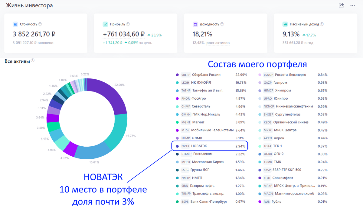 НОВАТЭК занимает немалую долю в моем портфеле и инвестировал я в него на фоне новостей о запуске масштабных проектов компании (Арктик СПГ-2, Ямал СПГ), а так же стабильных дивидендов. Акции НОВАТЭКа находятся на 6 месте по доли в структуре индекса Мосбиржи и на 5 по капитализации: В целом, это одна из самых крупных компаний нашей страны и "голубая фишка" фондового рынка РФ.