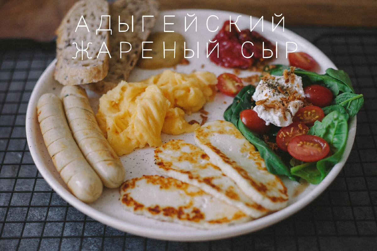 • Вяленые томаты Мало кто знает, что адыгейский сыр можно жарить. В таком виде он станет не только прекрасным дополнением к множеству блюд — салатам, бутербродам и т.д., а, быть может, и займет центральное место в вашей трапезе, как, например, в нашем завтраке. Нарежем сыр небольшими ломтиками приблизительно по 0,5см толщиной. Разогреем на сковородке половину чайной ложки масла гхи, выложим кусочки сыра на небольшом расстоянии друг от друга и обжарим на среднем огне по 3-4 минуты с каждой стороны. По желанию можно добавить соль, орегано, зиру или любые другие специи. Немедленно подаем! Тогда сыр останется нежным внутри и хрустящим снаружи. Приятного аппетита! Больше рецептов здесь.