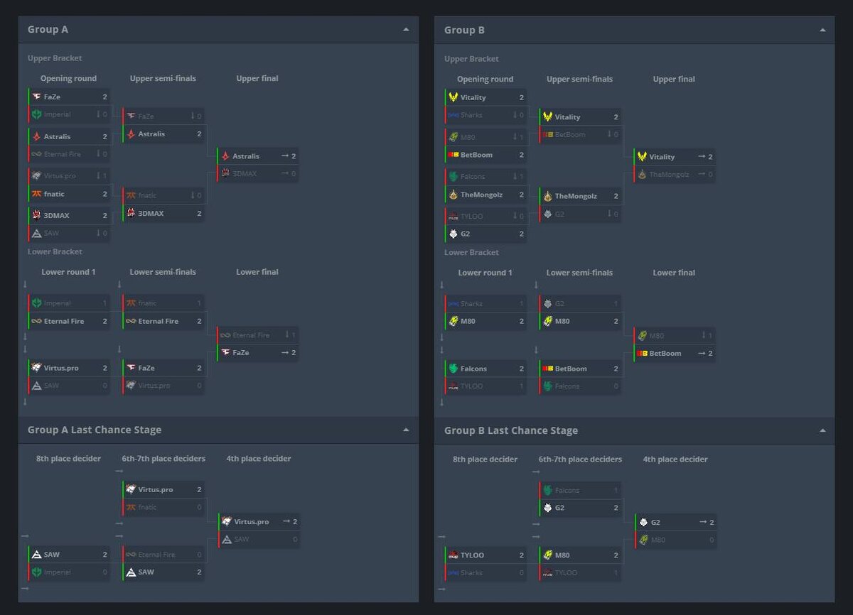 Итоги группового этапа ESL Pro League Season 19 по CS 2: команды, вышедшие в плей-офф С завершением группового этапа ESL Pro League Season 19, одного из самых ожидаемых турниров в мире CS 2, стали известны команды, которые продолжат борьбу за чемпионский титул в плей-офф. Соревнования, проходившие с 23 апреля по 12 мая 2024 года, собрали лучшие команды со всего мира и предложили зрителям невероятные эмоции и захватывающие моменты. В рамках первой стадии 32 команды были разделены на четыре подгруппы, из каждой из которых в плей-офф пройдут по четыре лучших коллектива. Участие в ESL Pro League приняли все ведущие коллективы мира, в том числе российские Virtus.pro, BetBoom Team и forZe Esports. Из группы А в плей-офф сумели попасть команды Astralis, 3DMAX, FaZe Clan и Virtus.pro, демонстрируя высокий уровень мастерства и стратегического мышления. Группа B представила таких участников, как Team Vitality, The MongolZ, BetBoom Team и G2 Esports, которые также подтвердили свой статус фаворито