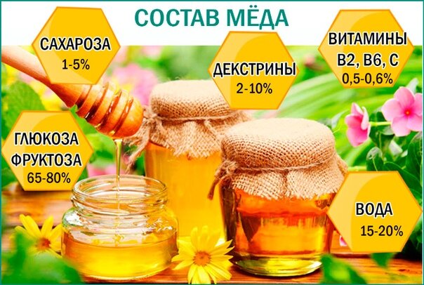 Химический состав натурального пчелиного меда сложен и подвержен значительным колебаниям. Он содержит сахара, декстрин, воду, белковые вещества, небелковые азотные вещества, витамины и прочие составные меда, полученные от различных видов нектара.