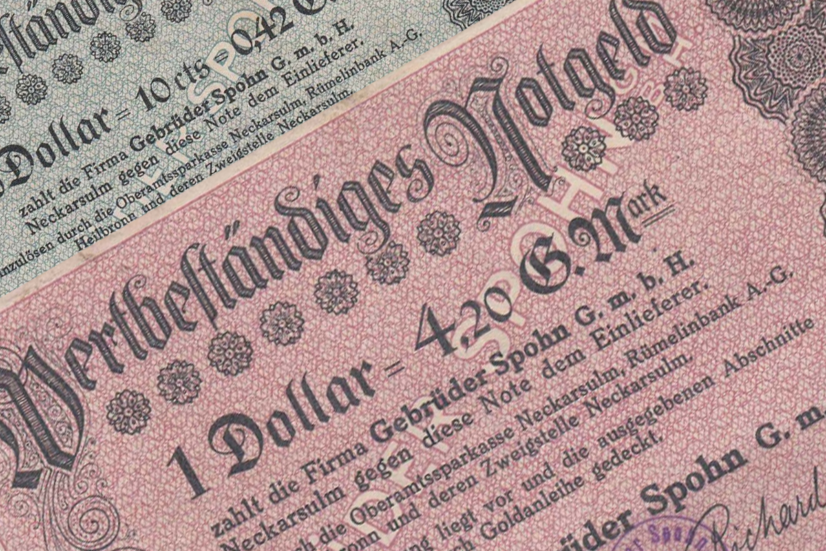 В конце 1923 года из-за гиперинфляции немецкая марка окончательно рухнула. Многим компаниям приходилось искать креативные решения для выплаты заработной платы, позволяющие создавать стабильные по стоимости средства на случай чрезвычайных ситуаций. Часто используемой формой, даже в небольших фирмах, были хеджируемые в долларах США долговременные банкноты в золотых марках, которые должны были быть одобрены рейхсминистром финансов. Компания братьев Шпон в Неккарзульме выпустила для этого в ноябре 1923 года банкноты в золотых марках. 1 ноября 1923 года Вюртембергский джутовый, ткацкий и мешочный завод братьев Шпон в Неккарзульме, выпустил банкноты в золотых марках с оговоркой о валюте (номиналом 1/20, 1/10, ¼, ½ и 1 доллар) номиналом 0,21, 0,42, 1,05, 2,10 и 4,20 золотых марок. Купюры можно было обналичить через городскую сберегательную кассу Неккарзульма и акционерное общество Рюмелинбанк в Неккарзульме. 28 ноября 1923 года общество выпустило дополнительные ценные чрезвычайные деньги в фо