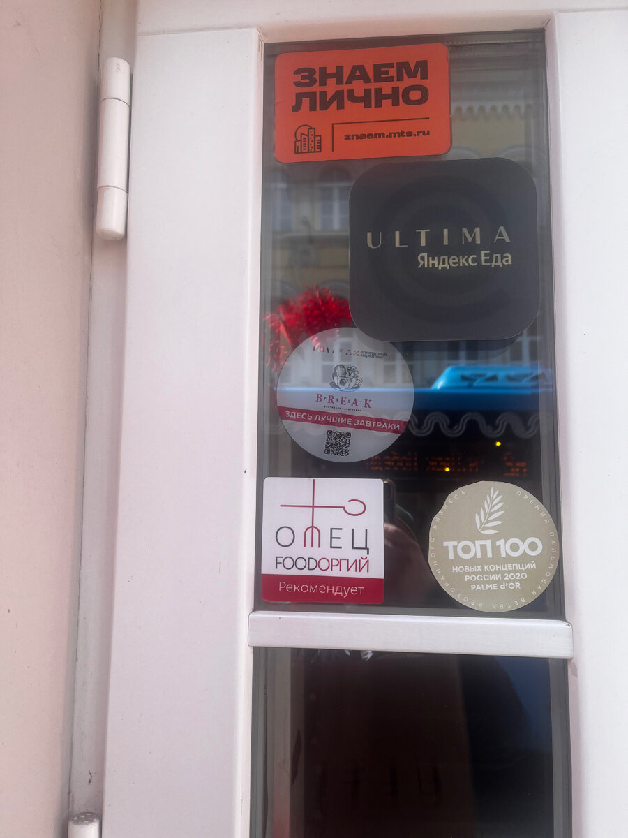 Левый нижний угол. Рекомендация от сомнительной личности которая не стесняясь берет по 90000 рублей за хвалебный отзыв о ресторане ( а у него все отзывы хвалебные) плюс едой. В гастромире нормальных людей данная наклейка как чумная печать…