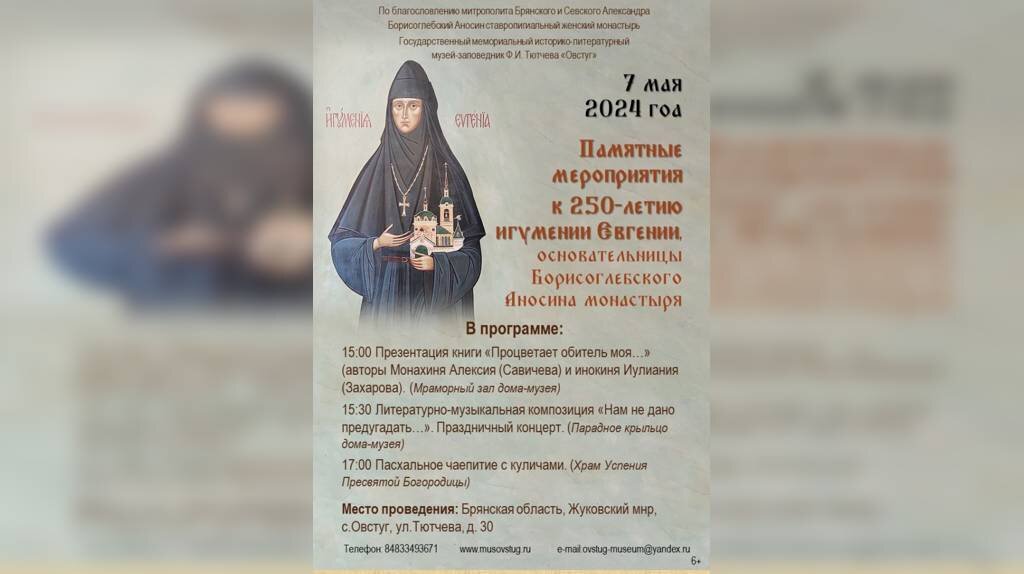 В музее заповеднике Ф.И. Тютчева «Овстуг» по благословению митрополита Брянского и Севского Александра состоится праздничное мероприятие, посвященное 250-летию Евдокии Николаевны Мещерской (1774-1837), урожденной Тютчевой, в монашестве Евгении – основательницы и первой игуменьи Борисоглебского Аносина монастыря в Подмосковье. Мероприятие пройдет во вторник, 7 мая. Евдокия Мещерская, родная тетка поэта Федора Ивановича Тютчева, в 1821 году, в память о трагически погибшем супруге, основала в селе Аносино Звенигородского уезда женскую общину и дом призрения, в 1823 году поступила в основанное общежитие, подав перед этим прошение об обращении общежития в монастырь, в том же году Е.Н. Мещерская была пострижена в монашество под именем Евгении. В честь юбилея выдающейся представительницы рода Тютчевых игуменьи Евгении в Овстуге пройдет обширная программа. В часы проведения мероприятий вход на территорию свободный. 6+ В Овстуге отметят 250-летие игуменьи Евдокии Мещерской