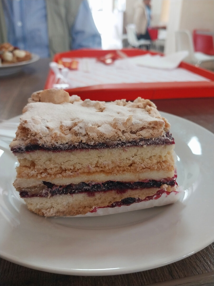 Меня тут радует мороженое (не люблю его, дома вообще фактически не ем, но тут вкусное... не жирное, но вкусное!); хороша сметана - она густая, но без характерного привкуса и желтоватого оттенка деревенской сметаны. Ещё в столовых выставляют какие-то освяные кисели... у меня они вызывают исключительно ассоциации из литературы о бедном послевоенном времени, но всё думаю, что надо рискнуть. Может быть. Пробую пирожные, которых в Иркутске нет. Это как в Петербурге берёшь буше (то, что сразу на пасять пришло!), тк его дома не продают. Здесь мой взгляд упал на пирожное Пани Валевская. С чёрной смородиной и меренгой. Вкусное!.. По вкусу напоминает королевское печенье с белками и вареньем. Тут есть пирожное Варшавское, есть Верона, Римские каникулы и ещё какие-то непривычные названия... Разумеется, есть медовик, Павлова и меренговый рулет - как везде. Морковный торт, рыжик и картошка:) Сама я беру лепёшку с сыром или с картошкой. Можно с мясом. Тут это что-то местное. Есть осетинские пироги, е