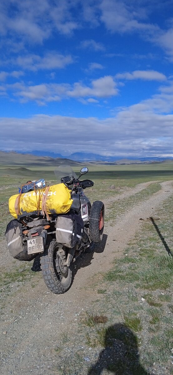 Вообщем, я не мог ни выдернуть его оттуда своими силами, ни даже повалить на бок и стащить в сторону. У меня, как у подготовленного и продуманного путешественника, была даже саперная лопатка на такой случай, но все мои копания не давали результата. Но и тут духи и боги не оставили меня, мимо (я думаю это был единственный раз за текущие, а возможно и за несколько суток) проезжали две машины, Лэнд Крузер 100 и кроссовер Лексус посовременней, они остановились и помогли мне вытащить мотоцикл. Супруга водителя Лекса говорила по английски и я смог ей объяснить, что ищу брод через реку и направляюсь в Ногонуур. Водители махнули мне что бы я следовал за ними. Вместе с ними я проехал ещё один или два брода, серьезнее которых я не проезжал за все путешествие, но затем мы подъехали к третьему. Первым поехала Тойота, и тут я немного струхнул-ее колеса полностью скрылись в воде и видно было что ее чуть-чуть сносит течением. Водитель Лексуса въехал в вводу и пытался закрыть меня от течения, я ехал рядом с ним, но он ехал слишком медленно боясь залить капот, я так не мог, поэтому выехал вперёд и тут же меня повалило течением, я удержался на ногах, а мот еле еле держал между ног под углом где то 45 градусов и теряя силы орал Хелп и Памагите))) Но ребятам надо было сначала выехать самим, они выехали на тот берег, сняли штанишки (ну не мочить же самом деле) и поспешили, по пояс в воде, ко мне на помощь. Так трое монголов удерживали мой мотоцикл со стороны куда идёт течение, что бы я не падал, а я газовал по камням. Как я не заглох и не залил воздухозаборник, я не знаю, но я выбрался и из этого рукава. Спасибо вам огромное граждане монголы, дай вам Бог и боги всяческих удач и богатств🙏🙏🙏. Убедив меня что дальше только мелкие протоки они поехали дальше, а я, поотстав, за ними. Причем водитель Лексуса ехал помедленнее и все смотрел еду ли я все ли в порядке, просто Аригато🙏. Через какое то время и он скрылся за поворотом и тут как раз я, проезжая маленький бродик, на спуске к нему выбрал чуть неверную траекторию и упал. Сил уже никаких не было, я ворочал лежащий мотик по земле, надеясь найти позицию поудобнее и поднять его и тут увидел возвращающийся Лексус, просто не человек, а Человечище, видимо увидев, что меня долго нет решил вернуться и проверить как я там. Мы подняли мот, он стал угощать меня холодным пивом, но я как дисциплинированный водитель отказался, тогда он угостил меня баночкой какого то сладкого лимонада, которую я с благодарностью принял и выпил пока она не нагрелась. Вообщем, кто вам скажет , что монголы злые неприветливые или грубые люди, плюньте за меня тому в лицо.