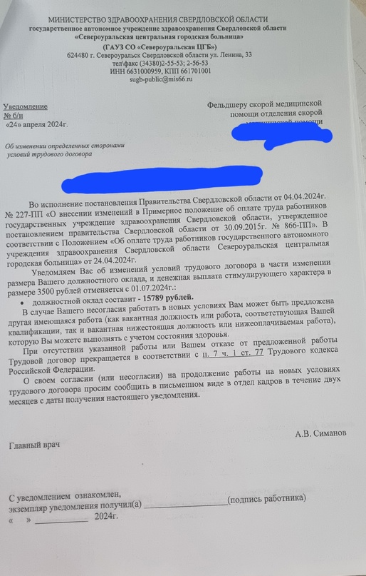 Подарок ко дню скорой помощи от главного врача ГАУЗ СО "Североуральская ЦГБ". Повысив оклад на 2500, (с 13200 рублей до 15789 рублей), убрал стимулирующую выплату в размере 3500 с 01.07.24. В связи с такими изменениями, заработная плата работников Скорой медицинской помощи вновь не выросла, а уменьшилась. Удивительно, правда?Мало того, что государство вычеркнуло фельдшеров Скорой медицинской помощи из первичного звена, лишив обещанных 30 000 рублей... Дак еще и тут такой подарок. На скорой помощи критический дефицит кадров. Работники увольняются. Из 40 положенных выездных фельдшеров работают 11 человек на 1,5-2 ставки. За счет чего и выполняется дорожная карта. Из 4-х положенных выездных бригад работают в основном 3 (из-за дефицита кадров в составе одного фельдшера и водителя). С такими условиями труда уйдут последние фельдшера. Жаль. Зато в комментариях у меня люди пишут, что враньё всё это чистой воды! Сегодня прочла мнение подписчика одного... Мол, ниже 100 тысяч зп нет у медиков