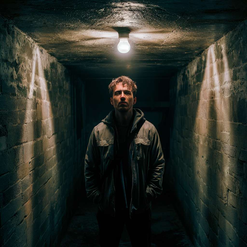 В темноте подвала, где воздух насыщен запахом плесени и гнили, Дэниел медленно приходит в себя. Голова его гудит, а память отказывается вспоминать, как он здесь оказался. Единственный источник света — мерцающая лампочка на потолке, которая бросает неуверенный свет на мокрые каменные стены, создавая танец теней, который кажется ему зловещим предвестником.