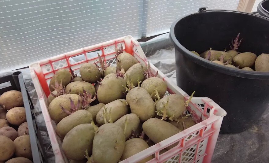 За полторы-две недели до посадки я достаю отобранные клубни картофеля из подвального хранилища и переношу их в теплицу для проращивания. В теплых условиях клубни быстро просыпаются от зимней спячки и начинают прорастать.