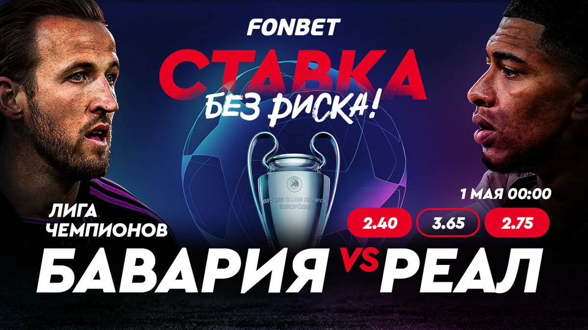 В ночь с 30 апреля на 1 мая пройдёт первый полуфинальный матч Лиги чемпионов между «Баварией» и «Реалом». К важнейшим играм еврокубков FONBET запустил акцию «Ставка без риска». Для участия нужно зарегистрироваться по этой ссылке, кликнуть на специальный баннер в разделе «Акции» и сделать ставку минимум на 1000 тенге с коэффициентом от 2.00 на любой из первых матчей полуфиналов еврокубков. В случае проигрыша полная сумма ставки (но не более 500 000 тенге) вернётся вам на бонусный счёт! «Бавария» – «Реал»: прямая трансляция В прямом эфире игру покажет Qazsport, встреча начнётся в 0:00 по казахстанскому времени в ночь со вторника (30 апреля) на среду (1 мая). Следить за ходом матча можно будет на сайте и в приложении FONBET. Букмекер с лучшей VIP-программой в Казахстане бесплатно показывает своим пользователям матчи европейских топ-лиг. Достаточно зарегистрироваться здесь и пополнить счёт, тем более что на первый депозит FONBET даёт бонус до 200 000 тенге на первое пополнение счёта! Небол