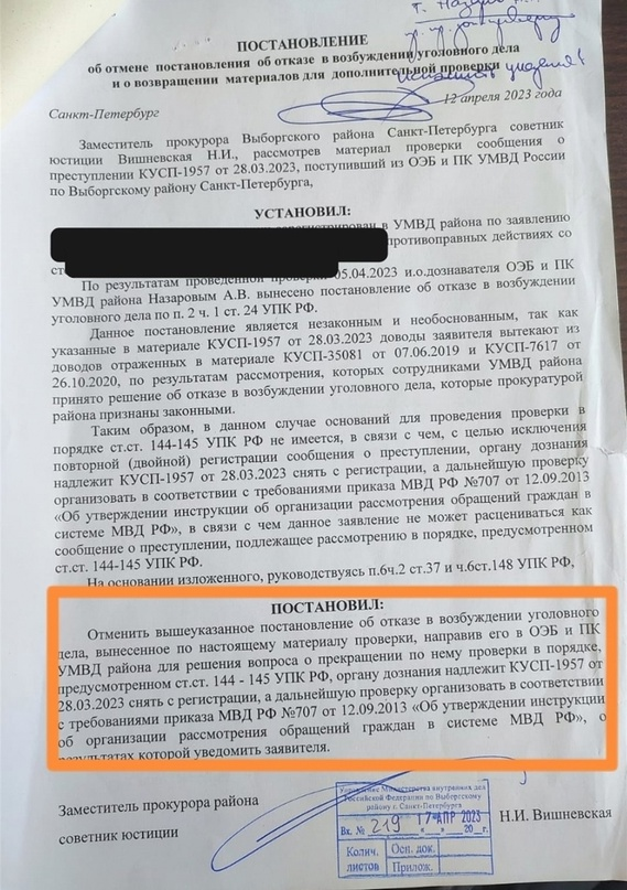 Все, кто хоть раз обращались в полицию за защитой своих прав, знают о талончике КУСП (книга учета сообщений о преступлениях) , копию который надо хранить в специальном отсеке под молнией в сумочке, а подлинник в утке, яйце и у Кощея. Это то, единственное, что подтверждает обращение в полицию. Сейчас с введением интернет технологий подобный талончик сохраняется в почте, о его копию все равно лучше сделать, например, сохранить в файл заявления, которое написано в полицию. А когда появилась возможность дать указание снять КУСП с регистрации? То есть это означает, что человек не обращался. Ссылка в постановлении идет на ст.ст.144-145 УПК РФ, которые предусматривают только три исхода после проведения проверки по заявлению: возбудить уголовное дело, отказать в возбуждении уголовного дела или передать дело по подследственности. Пунктом 4 ст. 144 УПК РФ предусмотрено, что заявителю выдается документ о принятии сообщения о преступлении с указанием данных о лице, его принявшем, а также дат