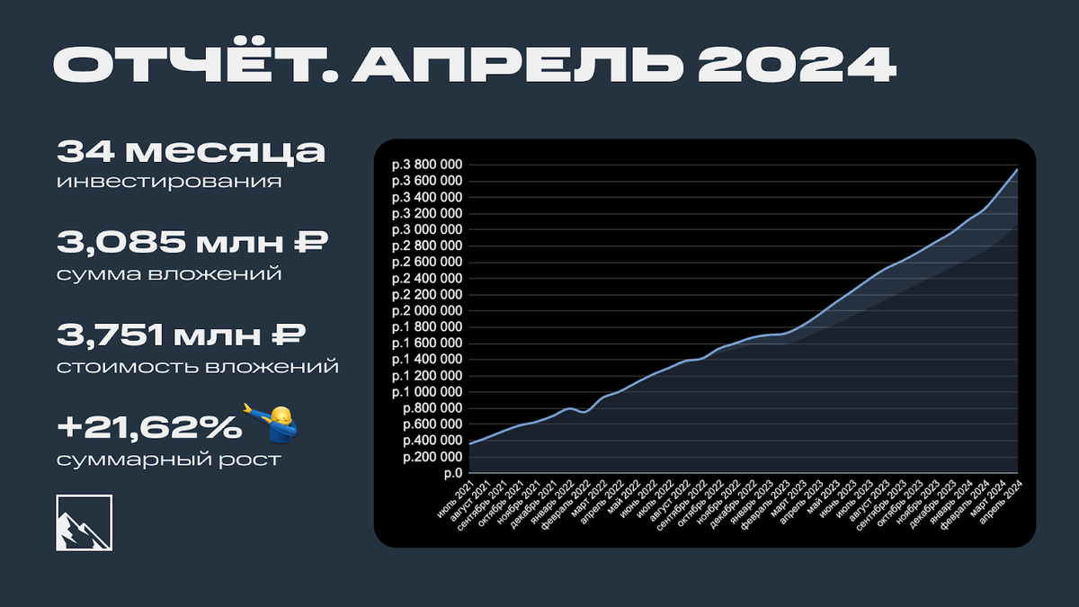 1 мая, значит пора идти на демонстрацию и подводить итоги апреля! Ежемесячно я пишу отчёт о том, что произошло по финансам и другим моментам. Напоминаю: я начал копить на квартиру в Сочи в июле 2021. 34 месяца позади. Погнали! Очень важное объявление: подписывайтесь на мой телеграм-канал. Скоро 10 000 подписчиков будет, сделаем красиво! Инвестиции Было на 1 апреля 3 498 081 ₽: Доставал из подвала транспаранты для первомайского нашествия и в одном из них нашёл свёрток с 200 000 рублей, которые решил проинвестировать. Покупал всё хорошее, ничего плохого не покупал, фокус был на длинные ОФЗ. Облигации: ОФЗ 26243, Русал 1Р7 CNY, Селектел 1Р4, Контрол Лизинг 1Р2, Дарс 1Р2, Элемент Лизинг 1Р8, Интерлизинг 1Р8, МСБ Лизинг 3Р3, Ойл Ресурс Групп БО-01, Новабев БО-П06, Фордевинд 05 Акции: Позитив (это был святой рандом), Новатэк, Роснефть, Лукойл, Совкомбанк, Газпром нефть, Яндекс Фонды: AKME, Парус ЛОГ Подробнее про покупки тут (часть 1) и тут (часть 2). Также поучаствовал в IPO МТС Банка и SPO