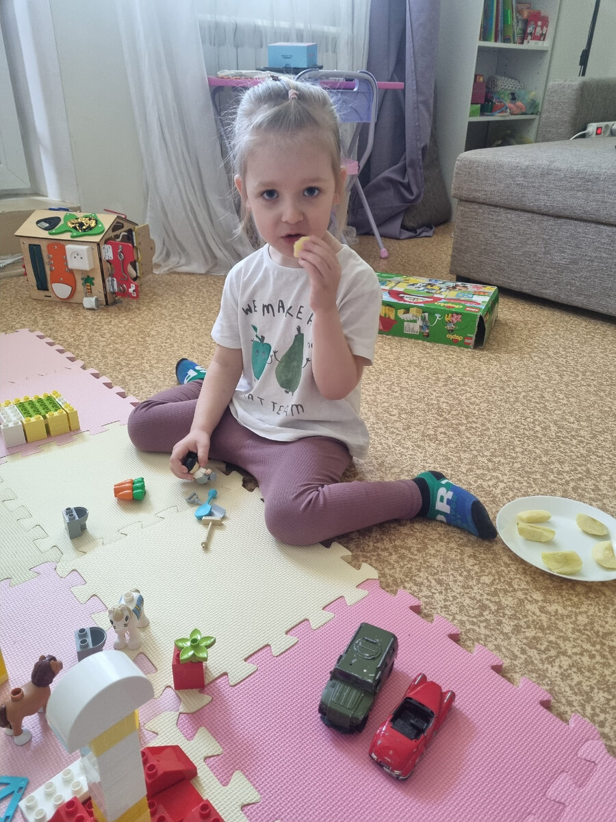 До обеда же мы просто играли и перекусили яблоками. Я Ксюше счищаю кожуру и сама стала в таком же виде есть яблоки, еще и на довольно тонкие дольки режу - мне с брекетами так удобнее. Кусать от целого яблока в моем случае точно не вариант.