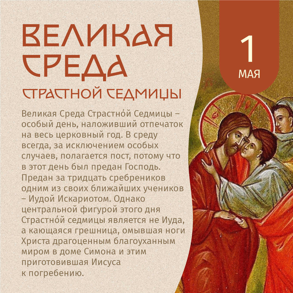 Великая Среда Страстнόй Седмицы – особый день, наложивший отпечаток на весь церковный год. В среду всегда, за исключением особых случаев, полагается пост, потому что в этот день был предан Господь. Подробнее рассказали в карточках: