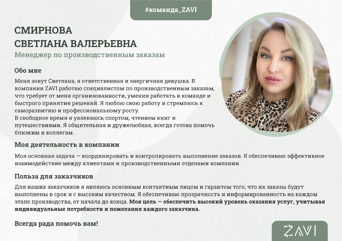Меня зовут Светлана, я ответственная и энергичная девушка. В компании ZAVI работаю специалистом по производственным заказам, что требует от меня организованности, умения работать в команде и быстрого принятия решений. Я люблю свою работу и стремлюсь к саморазвитию и профессиональному росту.