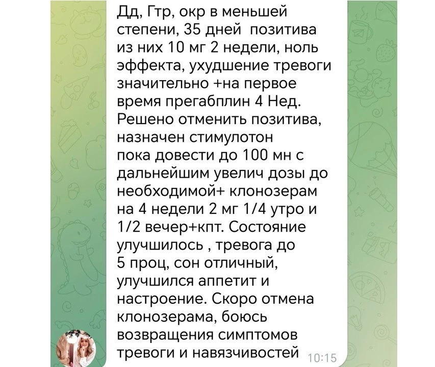 Лечение норм? Диагноз: генерализованное тревожное расстройство и обсессивно-компульсивное расстройство Первый этап. Назначен эсциталопрам (позитива - это эсциталопрам). Срок приема 35 дней, из них 10 мг - 2 недели. Параллельно прегабалин. Эффекта ноль, усиление тревоги есть. Второй этап. Выбран сертралин (стимулотон - это сертралин). Доза 100 мг, параллельно клоназепам (бензодиазепиновый транквилизатор) на 4 недели. Есть отчетливое улучшение, но страх отменять клоназепам, опасения, что усилится тревога и навязчивости. Как думаете, при ГТР + ОКР лечение корректное? Ошибки в терапии есть? Спойлер: ошибки не самые грубые, но отчетливые и потому страх отменять клоназепам обоснован. _______________________ Мысли о терапии. Исходим из идеи, что диагноз ГТР + ОКР верный. Выбор основного препарата на первом этапе вполне обоснован. Любой СИОЗС может быть выбран, эсциталопрам один из лучших по эффективности и переносимости, поэтому к выбору антидепрессанта никаких вопросов. Прегабалин в