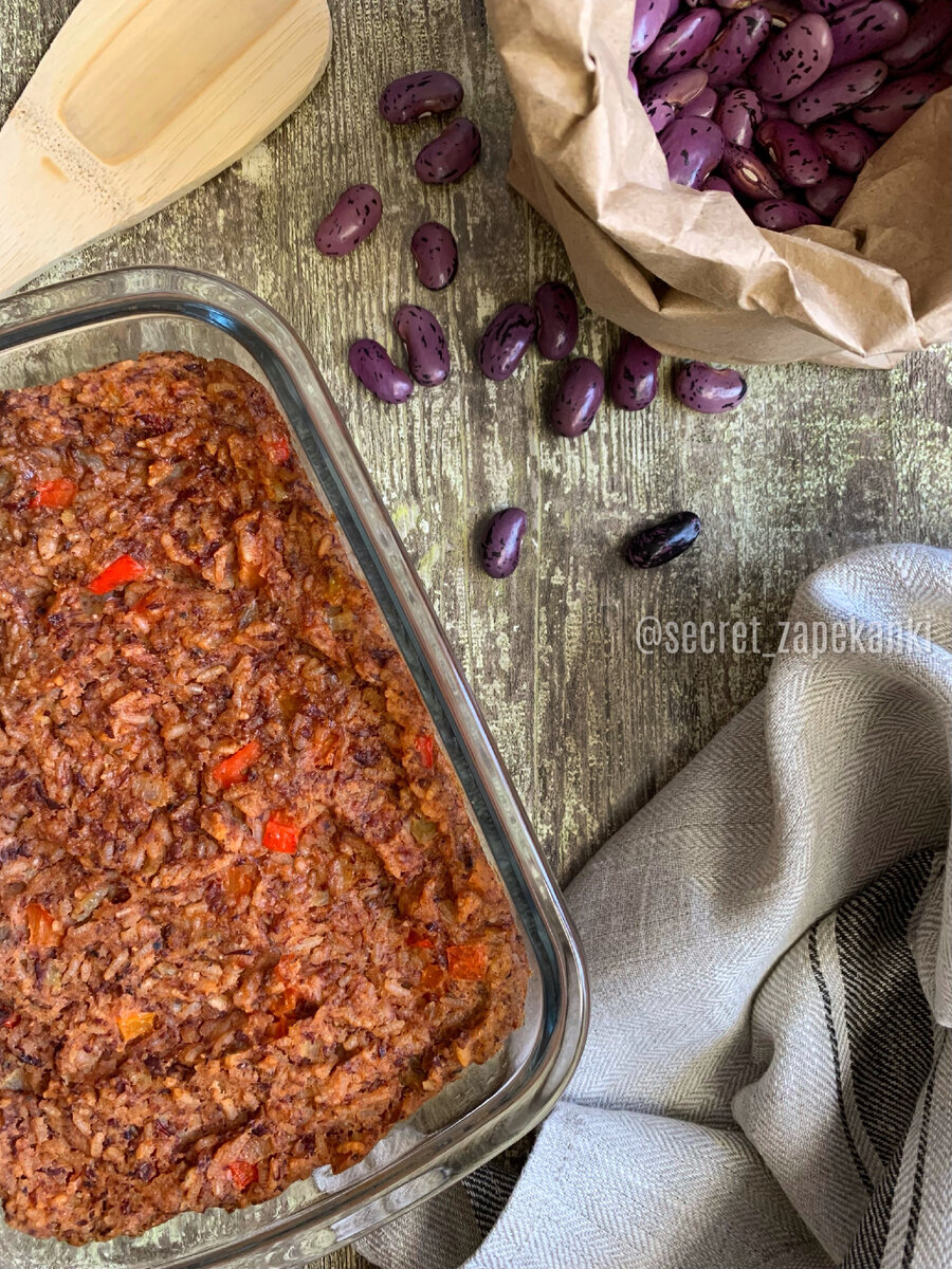 Великий пост выходит на финишную прямую. Самое время познакомить вас с моей любимицей – фасолью. А именно фасолью красной. Ну, что сказать про эту красотку – питательна и привлекательна, аппетитна и вкусна. И не имеет равных себе по содержанию такого важного вещества, как белок. Готовим: - рис отварной 450 г - фасоль красная отварная 350 г - лук 1 шт. - чеснок 2 зубчика - перец болгарский 1 шт. (150 г) - томатная паста 1,5 ст. л. - мука 2 ст. л. - орегано 0,5 ч. л. - растительное масло - соль, перец Форма для запекания 23*17,5*6 см, объёмом 1,25 л. Рис отвариваем по инструкции на упаковке. Рис желательно использовать клейких сортов. Фасоль тоже отвариваем до готовности по инструкции. Лук нарезаем кубиком, обжариваем на подсолнечном масле до золотистого цвета. Добавляем измельчённый чеснок и болгарский перец, также нарезанный кубиком. Всё вместе обжариваем 5-7 минут. Даём немного остыть. Фасоль измельчаем с помощью блендера до пастообразного состояния. Теперь соедин