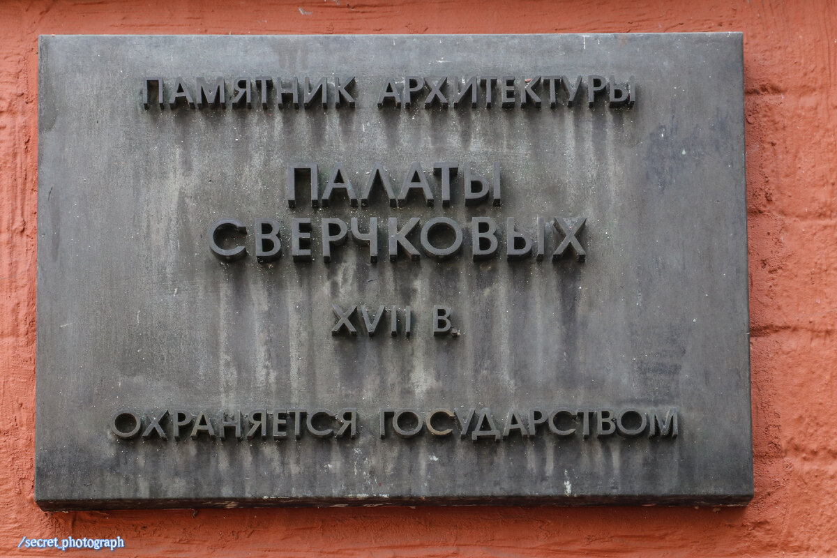 Окна в большинстве старинных палат делали так, как было удобнее и практичнее. На палатах Сверчкова, в центре фасада на втором и первом этаже, справа виден портал, а слева окно. Это окошко предназначалось для наблюдения за лестницей, можно было увидеть, кто пришёл... Такие варианты не редкость. В палатах Аптекарского приказа такое окошко имеет косое расположение, таким образом можно было смотреть на площадку перед входом даже из соседнего помещения! Возможно, что в этом месте палат располагалось караульное помещение»