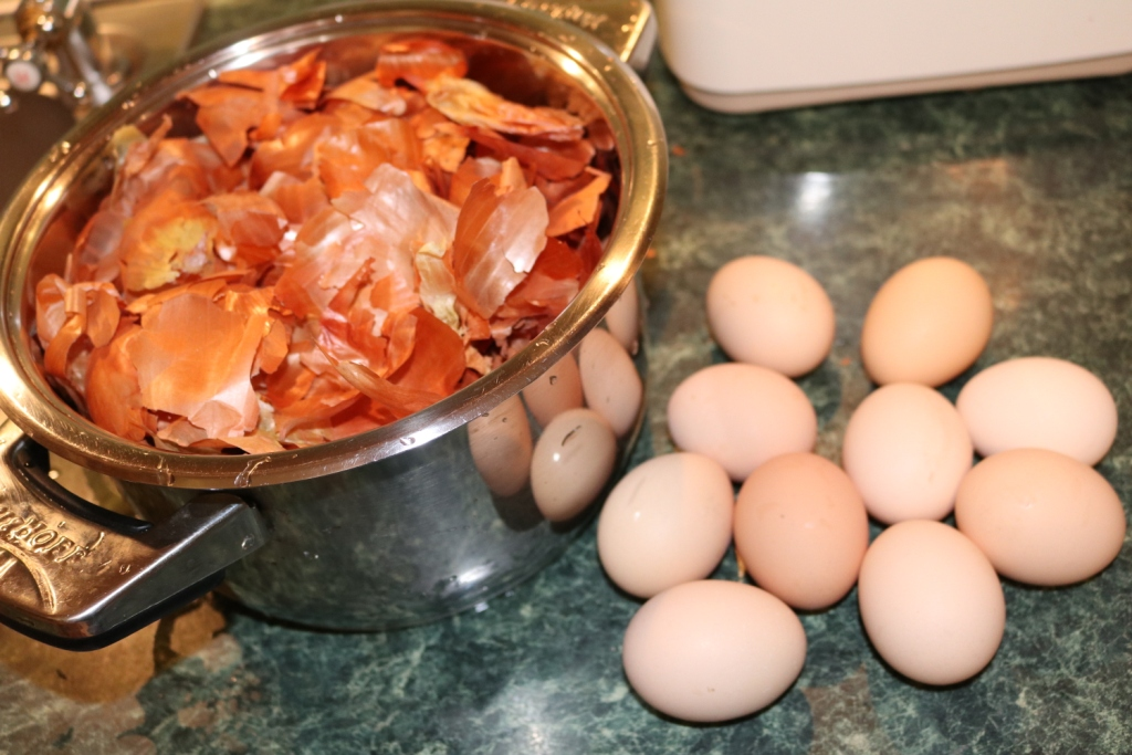 Я придерживаюсь традиционного способа покраски яиц, так, как делали это мои бабушка, прабабушка, здесь ведь ничего придумывать не надо, не надо тратить деньги на краску или наклейки, и в конце концов яйцо покрашено? Покрашено, традиция соблюдена, что ещё надо! Кто не запасся луковой шелухой, идите в магазин, там вам дадут набрать её бесплатно. Через дуршлаг промываю луковую шелуху. В кастрюлю кладу луковую шелуху, 3-4 горсти, затем заливаю холодной водой так, чтобы потом она покрыла яйца, и варю минут 10, огонь выключаю. Жду, красная вода должна остыть, и стать насыщенного бордового цвета. Вода стала холодной, вынимаю шелуху. Мою яйца обязательно, из-за боязни сальмонеллёза. Опускаю яйца в красную воду, и варю 10 мин. после закипания. Когда яйца закипят, огонь убавляю. Особенности, которые я обязательно соблюдаю: Холодная вода должна покрывать яйца. Хранить яйцо в холодильнике не обязательно, но если я достаю его из холодильника, то даю согреться, чтобы оно при варке не лопнуло. Яйцо п