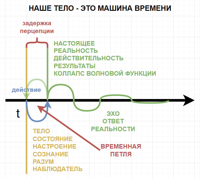 Наше тело – это машина времени. Это может показаться абсурдным, но благодаря задержке перцепции, тело, как наблюдатель, сдвинуто во времени в прошлое. Этот эффект создает ряд интересных парадоксов, связанных с коллапсом волновой функции при наблюдателе, сдвинутым в прошлое.