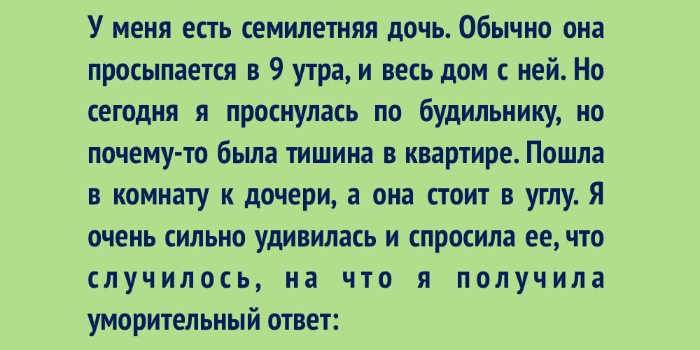 Никто не знает, что принесет следующий день, но в одном можно быть уверенным — встреча с абсурдом гарантирована. Давайте рассмеемся вместе над десятью смешными случаями, которые покажут, как странна и забавна может быть наша жизнь. А у тебя вообще… Позволили 7-летнему сыну гулять одному. Мы смотрим на него с балкона, чтобы убедиться, что все в порядке. Когда он вернулся, он выглядел огорчённым и сказал: - На улице тётя сказала, якобы у меня кофта девчачья. - А ты ей что-то сказал? - Я сказал, что у неё усы, как у моего папы! Прогноз погоды по бабкам Из моего окна видно четыре подъезда и у каждого есть по две лавочки. На лавочках обычно сидят бабульки. Благодаря этому я понимаю, какая погода на улице, смотря сколько бабушек на лавочках. Если 2-3 бабушки, значит ветрено, холодно и сыро. Если 8-10 и более бабушек, значит хороший летний день. Но если бабушек нет вообще, это либо апокалипсис на улице, либо по телевизору крутят “Жить Здорово”. Нужно через все пройти Сосед по общаге думал, чт