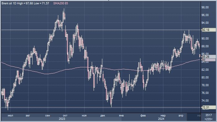 Давление на цены оказывает снижение геополитической премии из-за надежд на прекращение огня на Ближнем Востоке. График нефти марки Brent интервалами в 1 день Цены на нефть падают третий день в среду, 1 мая, на фоне растущих надежд на соглашение о прекращении огня на Ближнем Востоке, а также из-за роста запасов и добычи сырой нефти в США, крупнейшем в мире потребителе нефти. Июльские фьючерсы на нефть марки Brent упали на 1,3% до $85,21 за баррель, а июньские фьючерсы на американскую нефть West Texas Intermediate снизились на 1,4% до $80,76 за баррель. Ожидания того, что соглашение о прекращении огня между Израилем и ХАМАС может появиться после усилий Египта по возобновлению зашедших в тупик переговоров между двумя странами, привели к снижению цен на нефть. «Возможность заключения соглашения о прекращении огня между Израилем и ХАМАС ослабила опасения по поводу эскалации конфликта и любых возможных перебоев в поставках», — заявили аналитики ANZ. Однако премьер-министр Израиля Биньямин Не