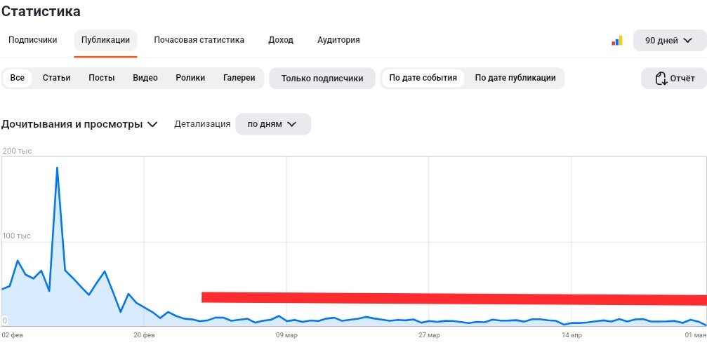Из графика выше видно, что с февраля началось ничем не обоснованное падение канала до определённых значений. Значения эти весьма понятны - количество стабильно читающих канал подписчиков. Оно каждый день примерно одинаковое.