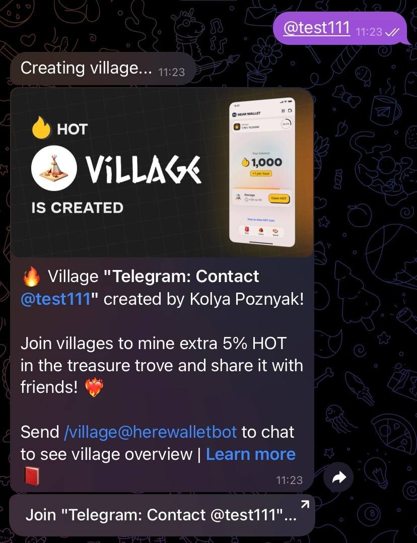 1) Created a village by adding a link of a self-created group/channel to @herewalletbot, or by adding @herewalletbot to the group/channel as a member and giving him admin rights.