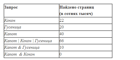 Кокон & Гусеница? Считается, что все запросы выполнялись практически одновременно, так что набор страниц, содержащих все искомые слова, не изменялся за время выполнения запросов. РЕШЕНИЕ Изобразим на диаграмме имеющиеся данные: Отметим область, которую нужно найти: Делаем вывод что: Кокон & Гусеница = Кокон + Гусеница + Капот - (Кокон ИЛИ Гусеница ИЛИ Капот) - (Гусеница И Капот) - (Капот И Кокон) = 22+20+40-66-10-0=6 ОТВЕТ 6