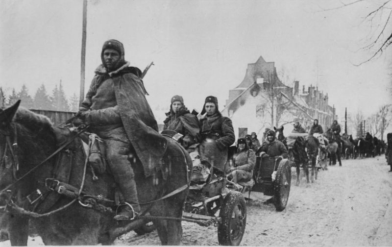 Бойцы 2-й гвардейской Таманской дивизии проходят через город Велау (ныне Знаменск в Калининградской области России) в Восточной Прусии — важный опорный пункт противника, захваченный в ходе тяжелых боев. На дальнем плане стены бывшего финансового управления округа Велау (ныне в здании размещаются начальные классы Знаменской школы).