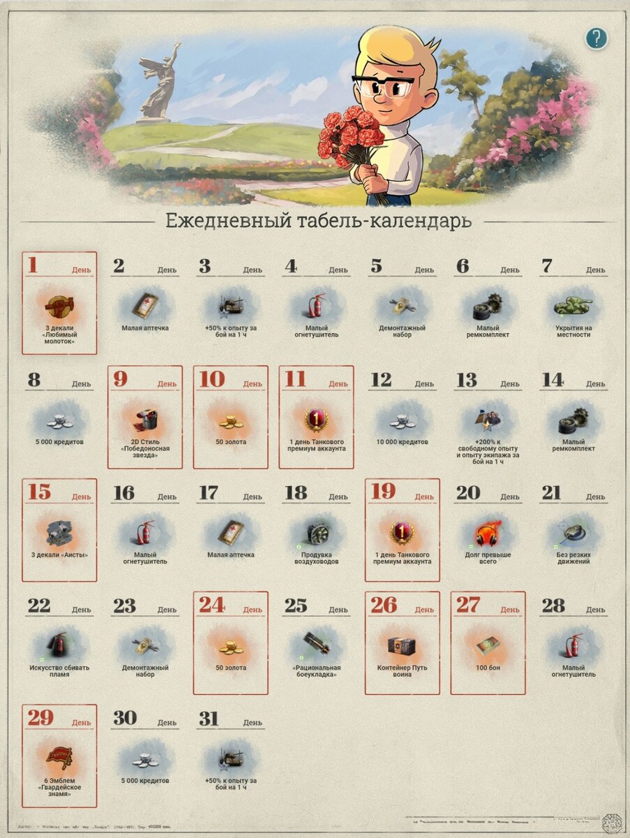 Майское обновление табель-календаря в Мире танков. Все плюшки месяца: Плюшки забираем здесь https://tanki.su/ru/daily-check-in/