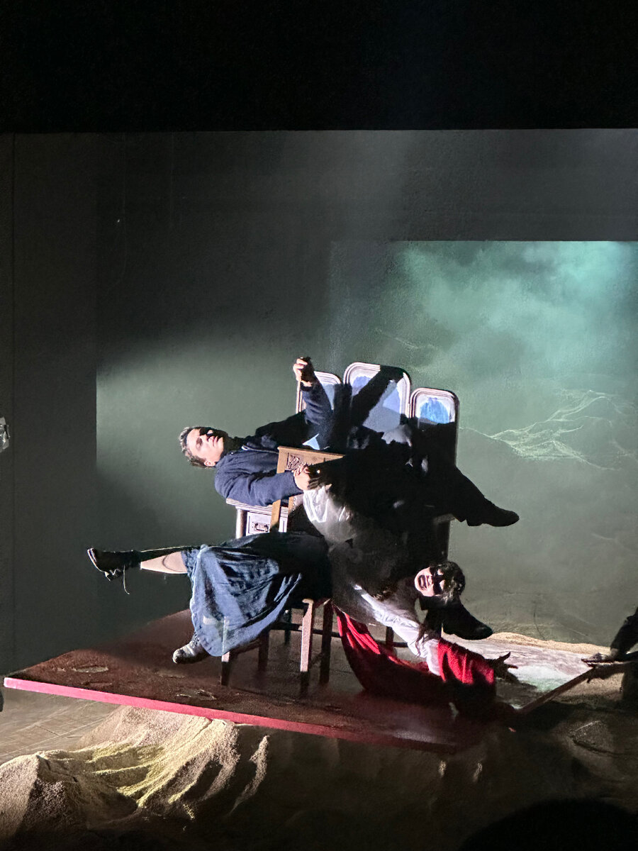 Стулья и шкаф как помост - часть метафоры «жизнь есть театр», а режиссер скрыт в таинственном свечении в глубине сцены.