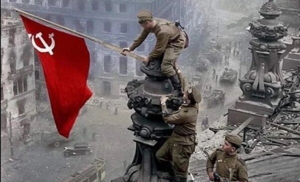 Сегодня ещё одна, наряду с Первомаем, очень знаменательная дата: 79 лет назад, в ночь с 30 апреля на 1 мая 1945 года ( по московскому времени это уже было 1 мая), над куполом поверженного Рейхстага в Берлине было водружено Красное знамя Победы. Напомню, что по приказу командира 756-го стрелкового полка 150-й стрелковой дивизии полковника Ф. М. Зинченко Красное знамя водрузили разведчики сержант Михаил Егоров и младший сержант Мелитон Кантария во главе с заместителем командира батальона по политчасти лейтенантом Алексеем Берестом под прикрытием автоматчиков из роты Ильи Саянова. Замечу, что сама надпись на знамени белой краской была сделана чуть позже, а именно 19 июня 1945 года. Т.е. над Рейхстагом развевался Государственный флаг СССР - красное полотнище с серебряными звëздочкой, серпом и молотом. Все адекватные люди в России прекрасно осознают, что именно под Красным знаменем была создана могучая Советская сверхдержава, одержана Победа над нацистской Германией, создан ядерный щит ст