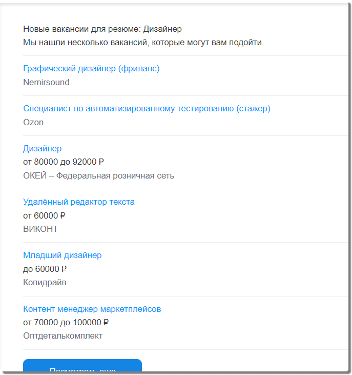 Я продолжаю, благо целый свободный день имеется, когда я уже несколько пришла в себя после рабочей гонки. "Вакансий полно! Работу легко можно найти, выбор огромный!" - слышу я часто. Да вот буквально вчера-сегодня было. Ну что, глянем, из чего выбирать предполагается? Я это сейчас пишу чисто поделиться. Кто давно работу не искал (не через знакомых) и не в курсе, как оно с этим обстоят и современных реалиях - вот посмотрите. Мое резюме озаглавлено "Дизайнер". Что предлагает мне НН в рассылке, которую каждый день шлет? Аж две дизайнерские вакансии - это уж много для подмявшего под себя весь рынок работных агрегаторов НН! Алгоритмы подборки профессионалы составляют, не хухры-мухры. Пункт первый - все бы хорошо, но фриланс. Увы, не мой вариант сейчас, мне на жизнь и кредиты зарабатывать надо. Пункт третий был бы прекрасен, но не был - дизайнер нужен на упаковку, требуется портфолио с аналогичным опытом. я упаковку не рисовала почти. Но все остальное - это че за дичь?! Тестировщик как в